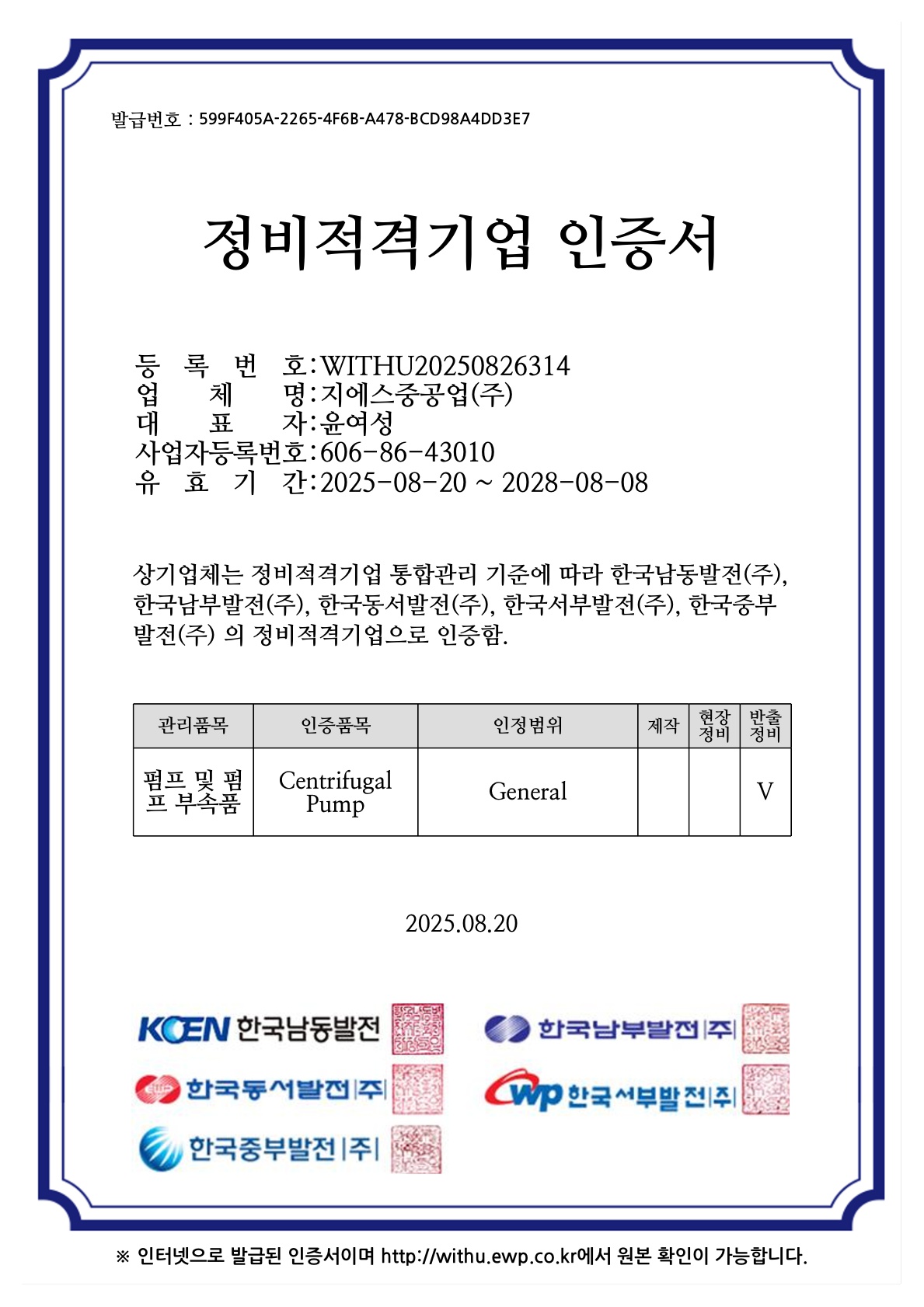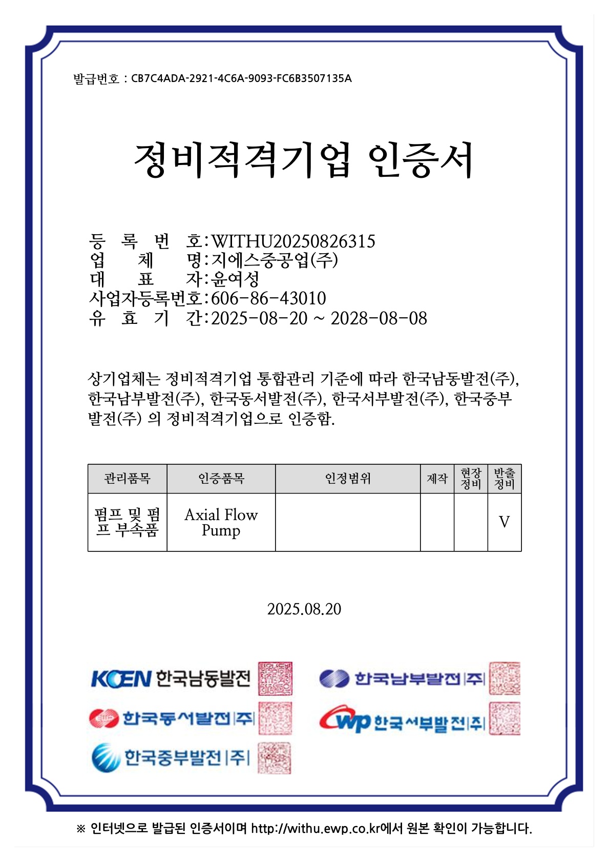정비적격기업 인증서